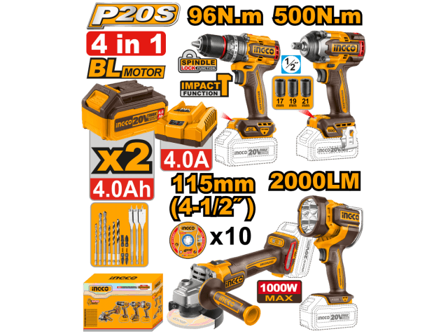 KIT A BATERÍA 20V 4 EN 1 C/BATERÍAS, CARGADOR Y ACCESORIOS INGCO
